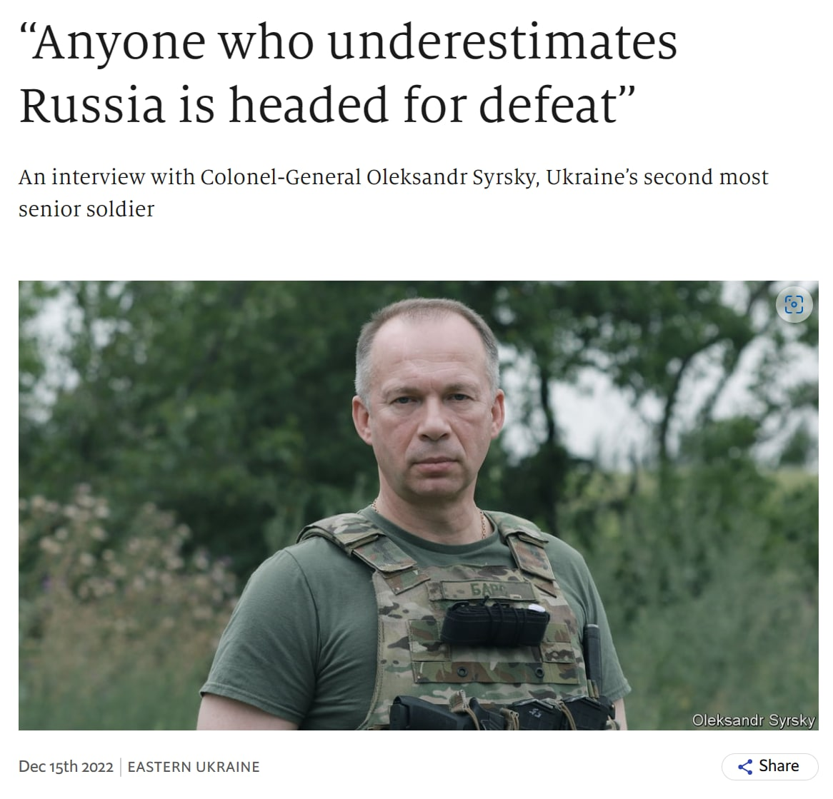 Кроме главкома ВСУ Валерия Залужного свое интервью журналу The Economist дал глава Сухопутных войск Украины Александр Сырский.