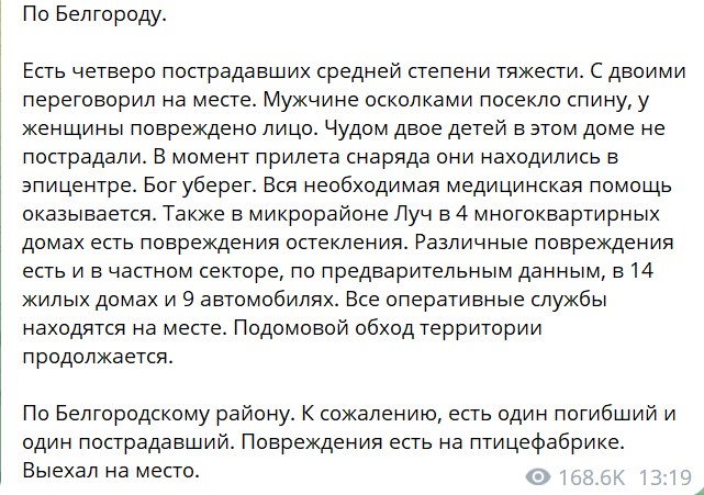 Губернатор Белгородской области Гладков также заявил, что в результате обстрела пострадала птицефабрика под Белгородом. Есть один погибший и один пострадавший.