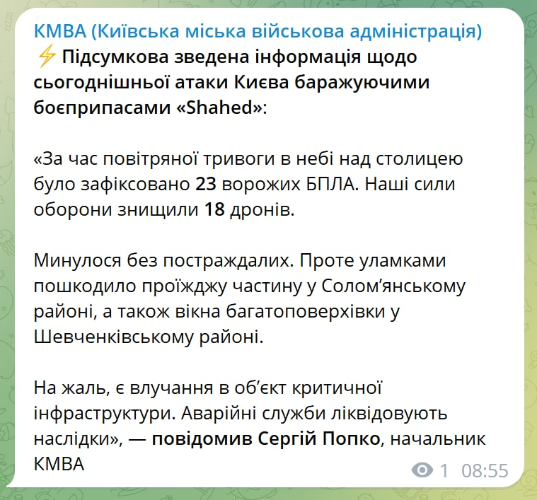 По уточненным данным, атаку вели 23 "Шахида", из них сбито 18. Их обломки повредили проезжую часть в Соломенском районе, а также выбили окна в Шевченковском.