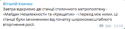 "Завтра открываем две станции столичного метрополитена - "Майдан Независимости" и "Крещатик" - и переход между ними", - написал Кличко.