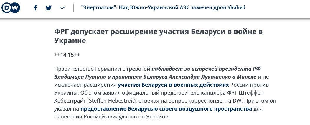Берлин опасается, что после встречи президентов РФ и Беларуси Владимира Путина и Александра Лукашенко Беларусь расширит свое участие в войне РФ против Украины.