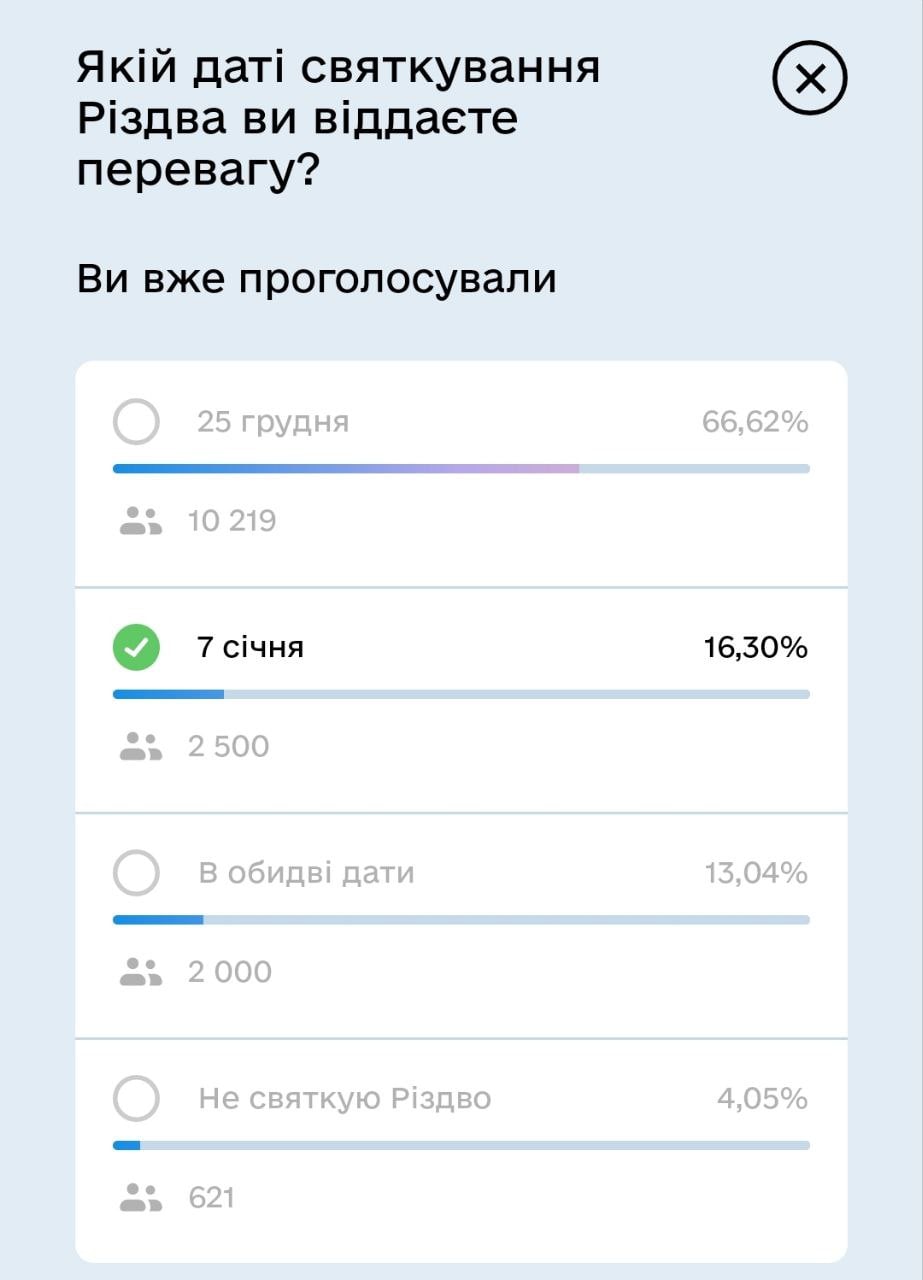 В приложении "Дия" запущено голосование по вопросу "Какой дате празднования Рождества вы отдаете предпочтение?".