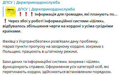 "В настоящее время пункты пропуска на западной границе, в том числе с Польшей, работают в штатном режиме. Базы данных и информационные системы, в том числе и "Шлях", работают исправно. Оформление всех категорий лиц, пересекающих границу, производится в установленном порядке", - говорится в сообщении.