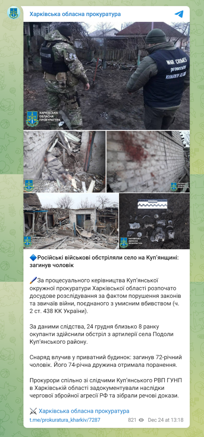 Под процессуальным руководством Купянской окружной прокуратуры Харьковской области начато досудебное расследование по факту нарушения законов и обычаев войны, соединенного с умышленным убийством (ч. 2 ст. 438 УК Украины).