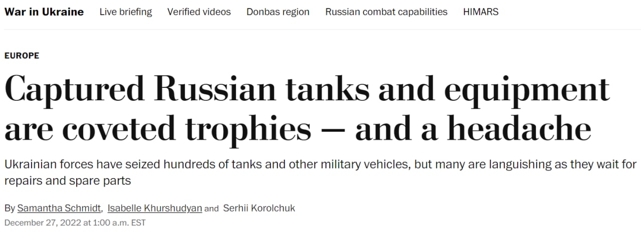 10:17 Украина с начала войны захватила сотни российских танков, БТР и БМП, но многие единицы техники стоят в ангарах, т.к. запчасти на российскую технику найти не просто, пишет The Washington Post.
