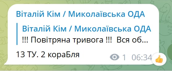 07:36 В небе 13 российских стратегических самолетов "Ту", в море - два носителя "Калибров", судя по короткому посту губернатора Николаевской области Кима.