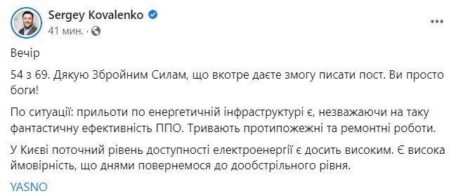 • Поблагодарил ПВО и Воздушные силы за отражение ракетной атаки. Рассказал, что было несколько прилетов, поэтому сейчас отключения есть в ряде регионов. Сложнее всего в Киеве и области, Одессе и области, Львовской области, Херсоне и области, Винницкой области и в Закарпатье. Допустил, что россияне могут еще раз попробовать нанести удар до Нового года.
