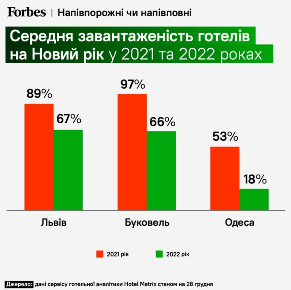 Несмотря на низкий спрос, цены на номера в гостиницах выросли. По данным Hotel Matrix, цены на новогодний номер в карпатских и львовских гостиницах выросли на 10–30% в гривне. Меньше всего гостиницы поднимали стоимость номеров в Одессе – на 10-15%.