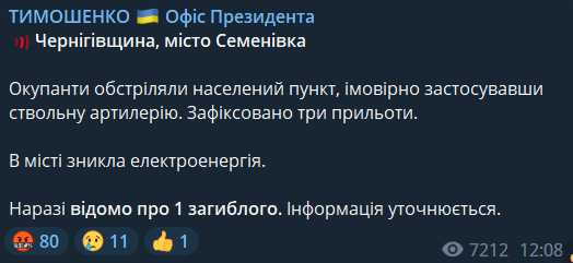 В Офисе президента Украины 30 декабря сообщают об обстреле города Семеновка Черниговской области.