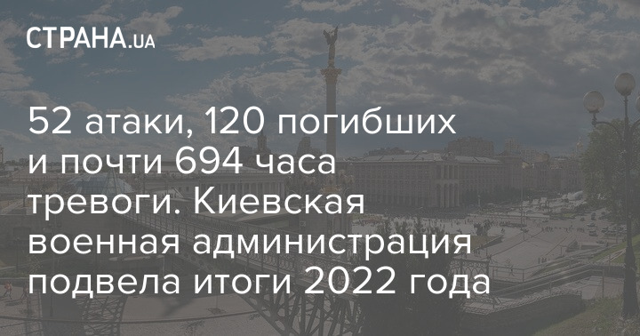 Киевская городская военная администрация подвела итоги уходящего 2022 года для Киева. Столица пережила 52 воздушные атаки, из-за обстрелов погибли 120 киевлян.
