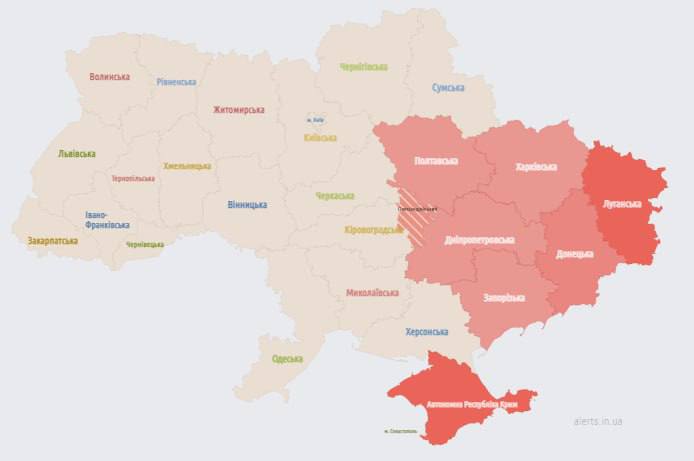 15.08 Карта воздушных тревог выглядит сейчас так. Местные паблики сообщают о взрывах в Днепропетровской области.