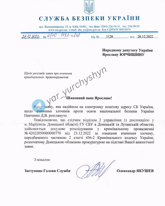 В ответе на депутатский запрос говорится, что следственный отдел СБУ по Луганской и Донецкой области проводит по фактам публикации материала расследование в рамках уголовного дела открытого 23 декабря.