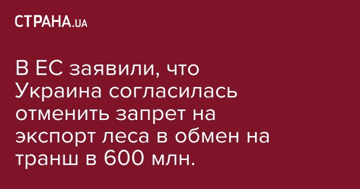 Как сообщала "Страна", ранее стало известно, что Украина не получит третий транш ЕС в этом году из-за запрета на экспорт леса. В Евросоюзе осенью выдвинули  новые условия для выделения Украине очередного транша макрофинансовой помощи в €600 млн, - это отмена запрета на экспорт леса и урегулирования по социальной помощи внутренним переселенцам.