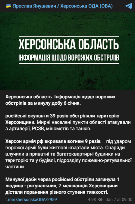 "Российские оккупанты 39 раз обстреляли территорию Херсонской области. Мирные населенные пункты области атаковали с артиллерии, РСЗО, минометов и танков", - пишет Янушевич.