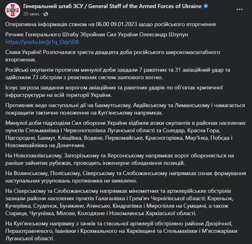 Ранее мы подводили итоги 319-го дня войны. Противник вел наступательные действия на Бахмутском, Авдеевском и Лиманском направлениях - и пытался улучшить тактическое положение на Купянском направлении. После православного Рождества и объявленного россиянами одностороннего перемирия возобновились ракетные удары со стороны РФ. Интенсифицируется переброска российских военных в Беларусь.
