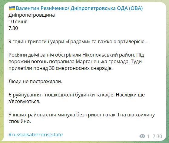 Россияне в ночь с 9 на 10 января ударили из "Градов" и тяжелой артиллерии по Днепропетровской области. Пострадал Никопольский район, он попал под обстрел дважды.