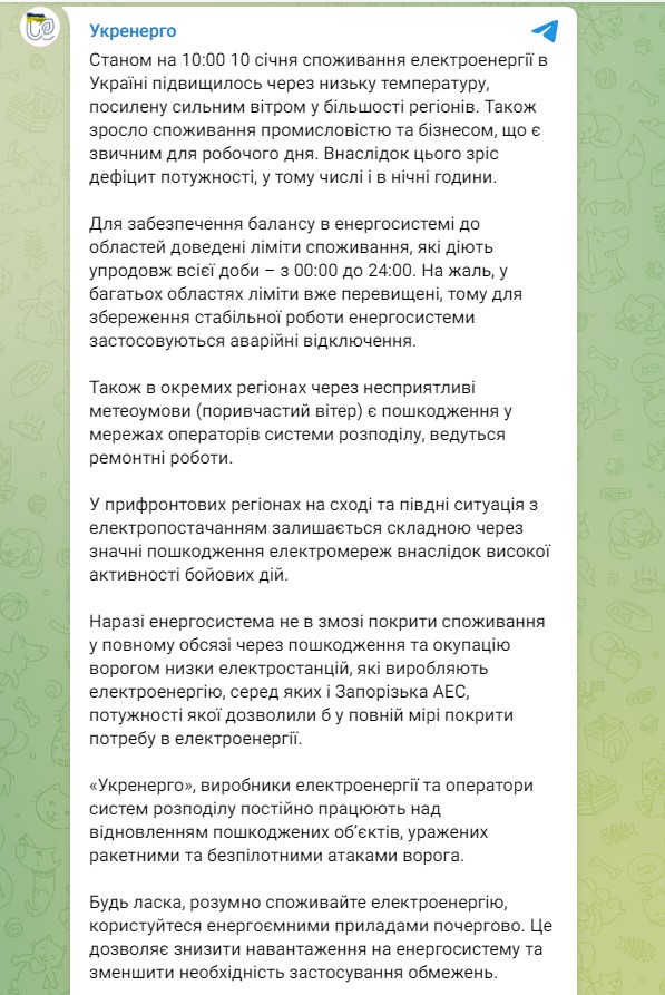 По состоянию на утро вторника, 10 января, потребление электроэнергии в Украине увеличилось из-за низкой температуры, усиленной сильным ветром в большинстве регионов. Также растет потребление промышленностью и бизнесом, в том числе и ночью. В связи с этим во многих областях вводятся аварийные отключения электроэнергии.