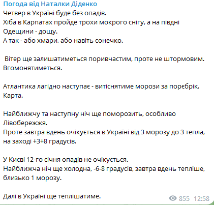 В Украине в четверг, 12 января, день в целом будет без осадков. Исключением могут стать Карпаты, где пройдет мокрый снег, а на юге Одесской области может быть дождь.