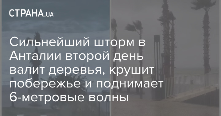 В турецкой Анталии уже второй день сильнейший шторм. Порывы ветра достигают 70 метров в секунду. Высота волн на пляжах достигает 6 метров, на курортах повалены деревья, повреждены десятки автомобилей.