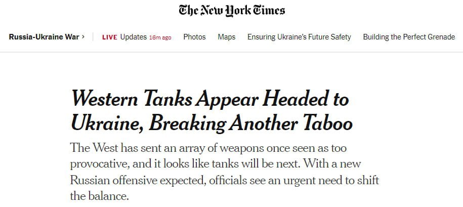Ранее главком Залужный заявлял, что Украина нуждается в 300 тяжелых танках западного образца и около 600 единицах другой бронетехники. Газета пишет, что, возможно, "сейчас мы наблюдаем первый этап выполнения указанного запроса".