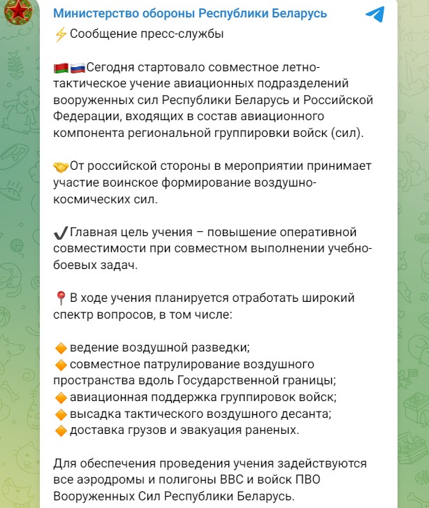 В ведомстве уточнили, что речь идет об авиационных подразделениях вооруженных сил Беларуси и РФ, которые входят в состав авиационного компонента региональной группировки войск (сил).