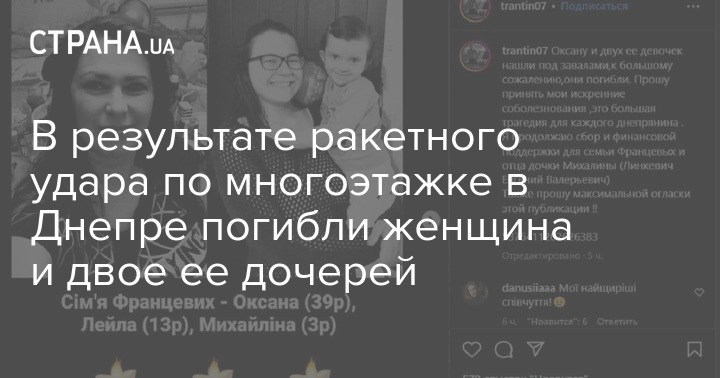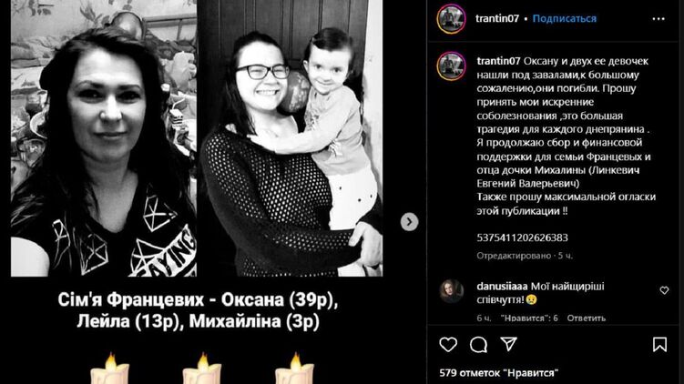 "Оксану и двух ее девочек нашли под завалами, к сожалению, они погибли. Это большая трагедия для каждого днепрянина", - сообщили родственники погибшей.