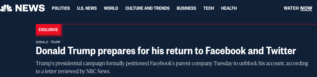 При этом NBC News сообщает, что Трамп ради выборов намерен вернуться в Twitter и Facebook, хотя ранее публично озвучивал нежелание это делать.