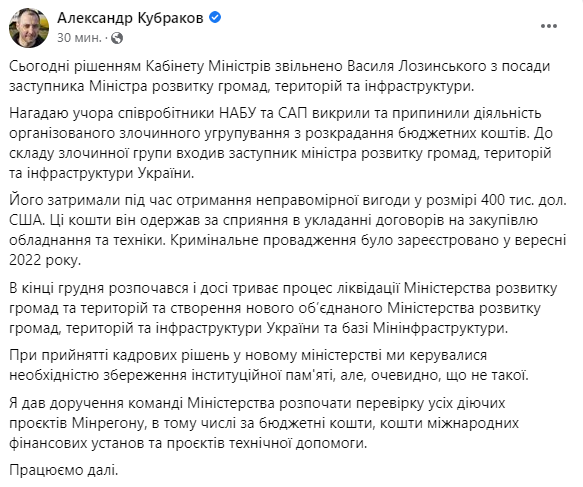 "Сегодня решением Кабинета Министров уволен Василий Лозинский с должности заместителя Министра развития общин, территорий и инфраструктуры. Я поручил команде Министерства начать проверку всех действующих проектов Минрегиона, в том числе за бюджетные средства, средства международных финансовых учреждений и проектов технической помощи", - написал глава Минрегиона.