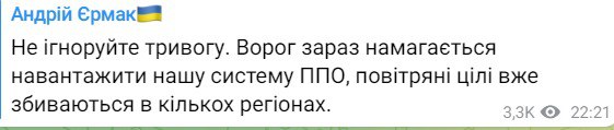 22:23 ПВО работает по воздушным целям в нескольких регионах, сообщил глава Офиса президента Андрей Ермак в своем тг-канале.