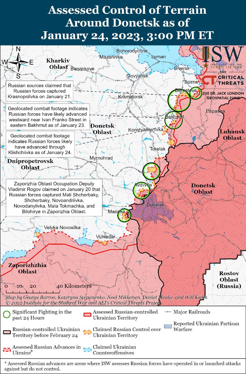 1. Российские войска продвинулись к западу от Подгородного (5 км к северо-востоку от Бахмута) и контролируют населенный пункт.
