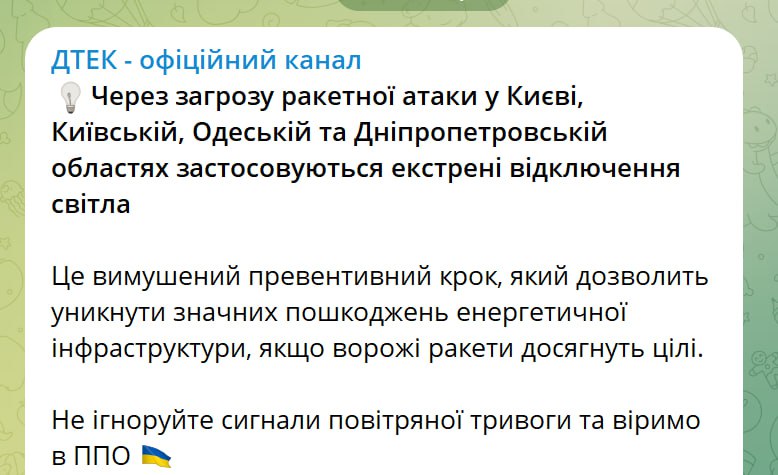 07:55 Без света уже столица, Киевская, Одесская и Днепропетровская области. Там начались экстренные отключения из-за возможной атаки.