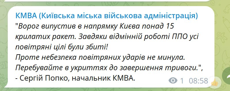 08:20 Киевская ОГА сообщает об угрозе масштабной ракетной атаки по всей территории Украины.