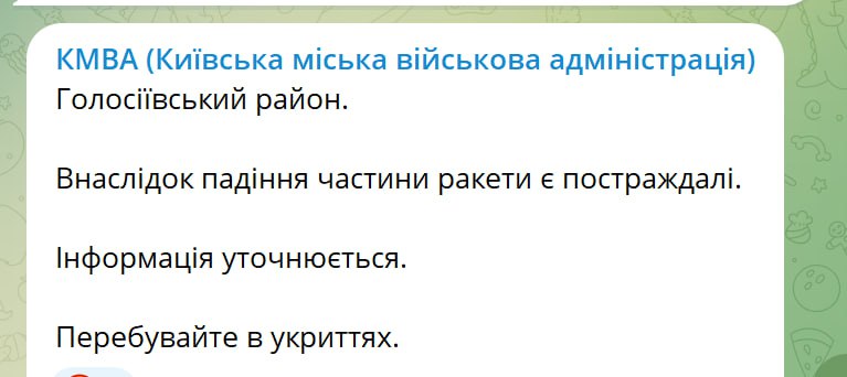 10:40 В Голосеевском районе Киева упала часть ракеты. Есть пострадавшие, сообщает городская военная администрация.