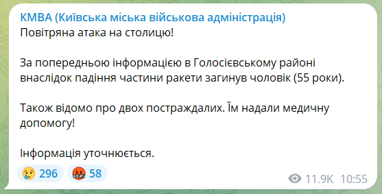 В Киевской городской военной администрации уточнили, что 55-летний мужчина в Голосеевском районе погиб, по предварительной информации, в результате падения части ракеты.