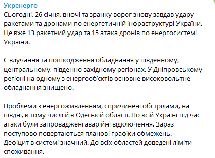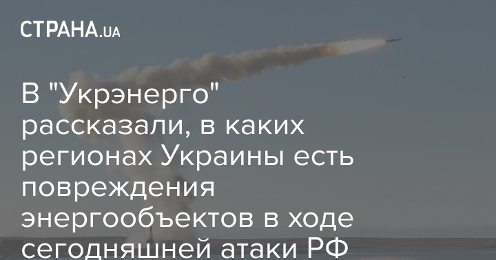 В "Укрэнерго" сообщают, что в результате сегодняшний ракетной атаки были повреждены объекты энергетической инфраструктуре в южном, центральном и юго-западном регионах.