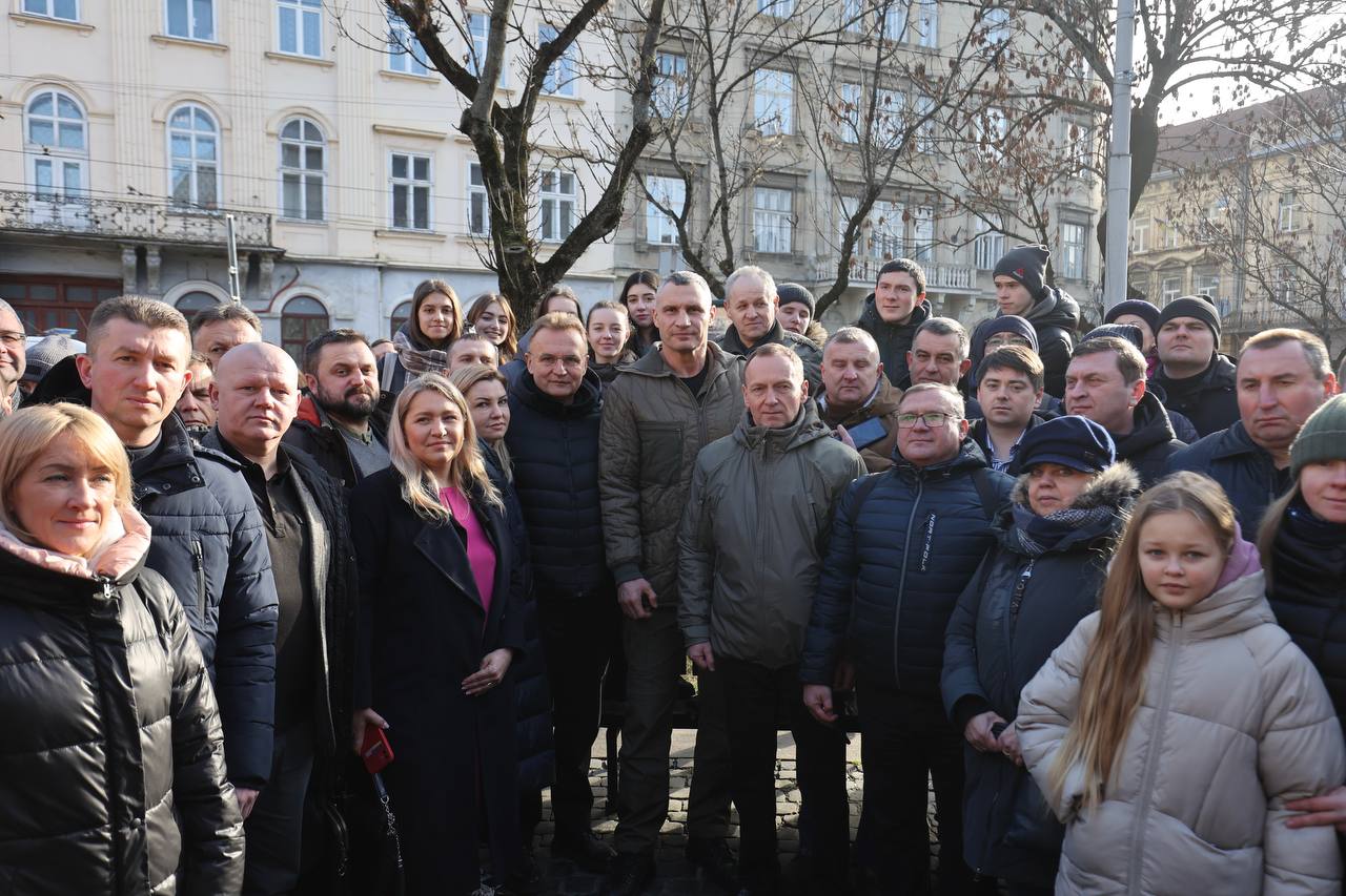 В частности, на фото видны мэр Львова Садовой, мэр Житомира Сухомлин и мэр Киева Кличко.