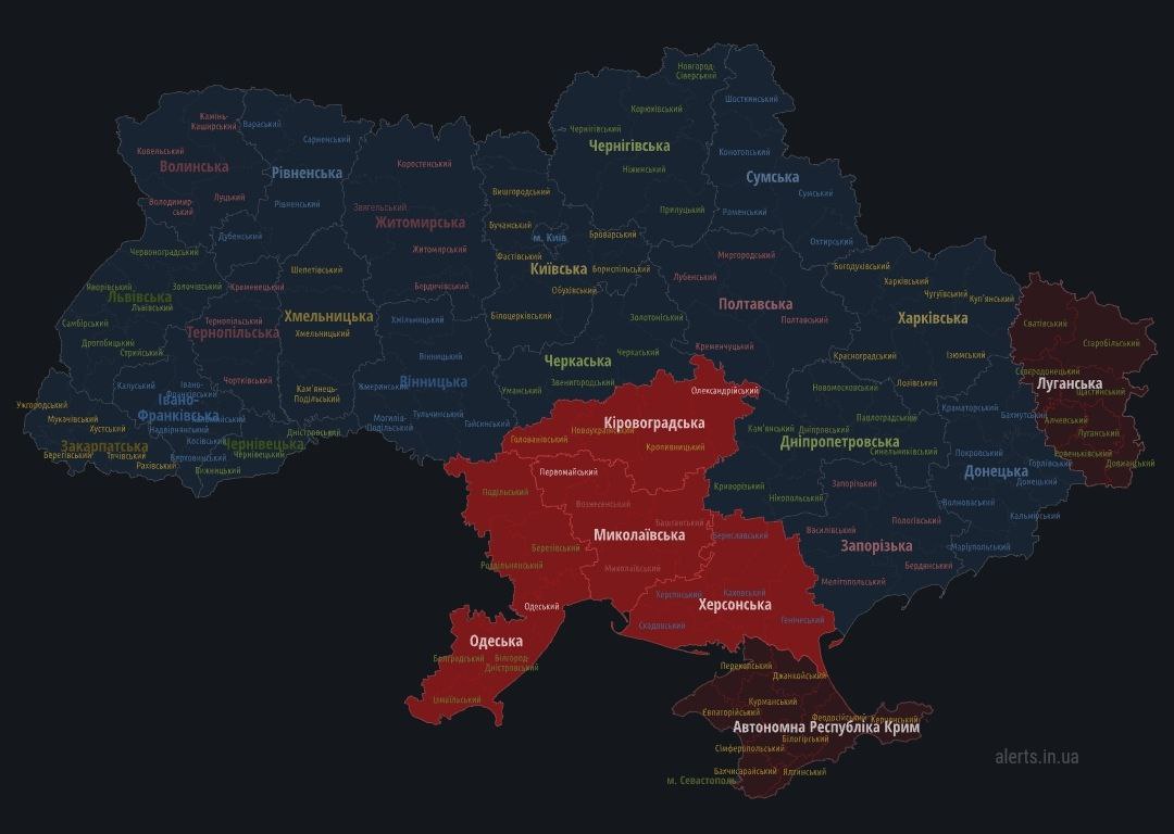 06.30 Карта тревог на сейчас. В Днепропетровской области угроза артобстрела.