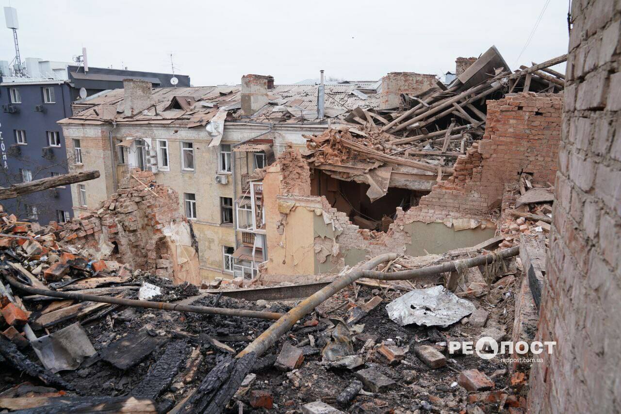 09.40 Так с утра выглядит разрушенный вечером дом в Харькове.