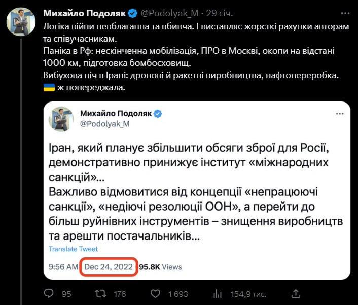 Речь о заявлении советника главы Офиса президента Михаила Подоляка, который написал в Twitter, что Иран не останется безнаказанным за помощь России в войне против Украины.