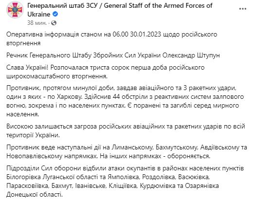 Утром 30 января Генштаб Украины обнародовал сводку о ситуации на фронте.