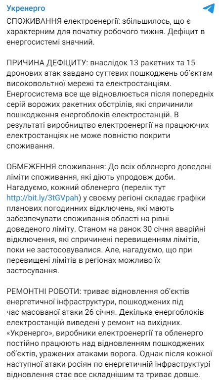 По состоянию на утро понедельника, 30 января, аварийные отключения не применялись ни в одной из областей Украины.