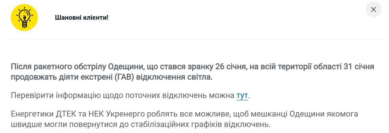 "К сожалению, в результате разрушений энергоинфраструктуры, в Одесской области продолжаются экстренные отключения" – сказано в сообщении энергетиков.
