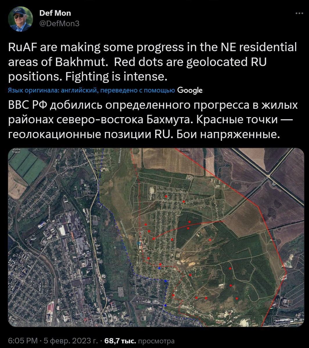 При этом зарубежный OSINT-аналитик DefMon (ведущий анализ данных по открытым источникам) еще в воскресенье сообщает, что россияне продвинулись в северо-восточных районах Бахмута.