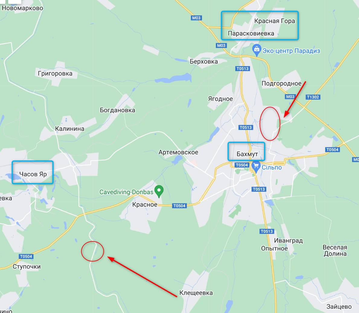 Российские телеграмм-каналы заявили, что "вагнеровцы" вошли в северные районы Бахмута и ведут там бои. Также россияне пишут о продвижении в районе Красной Горы и Парасковиевки - захват этих сел означает перерезание трассы со стороны Славянска и фактически полное блокирование Бахмута с Северска.