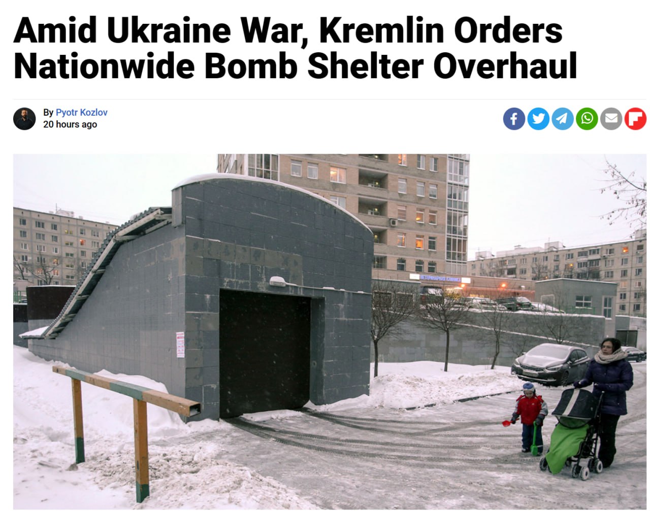 "Решение об инспекции сети бомбоубежищ было принято правительством весной. Команду на масштабную проверку и наведение порядка дали МЧС, Минобороны и [другие] гражданские министерства", - сказал российский чиновник, сославшись на сведения о заседаниях правительства по этому вопросу.