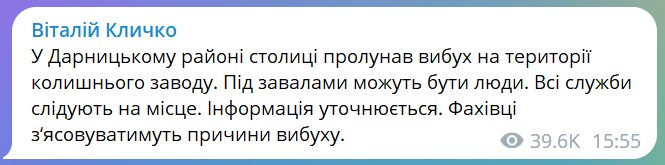 Позже в городской военной администрации заявили, что, предварительно, в Дарницком районе Киева взорвался газовый баллон. Есть пострадавшие, один человек погиб.