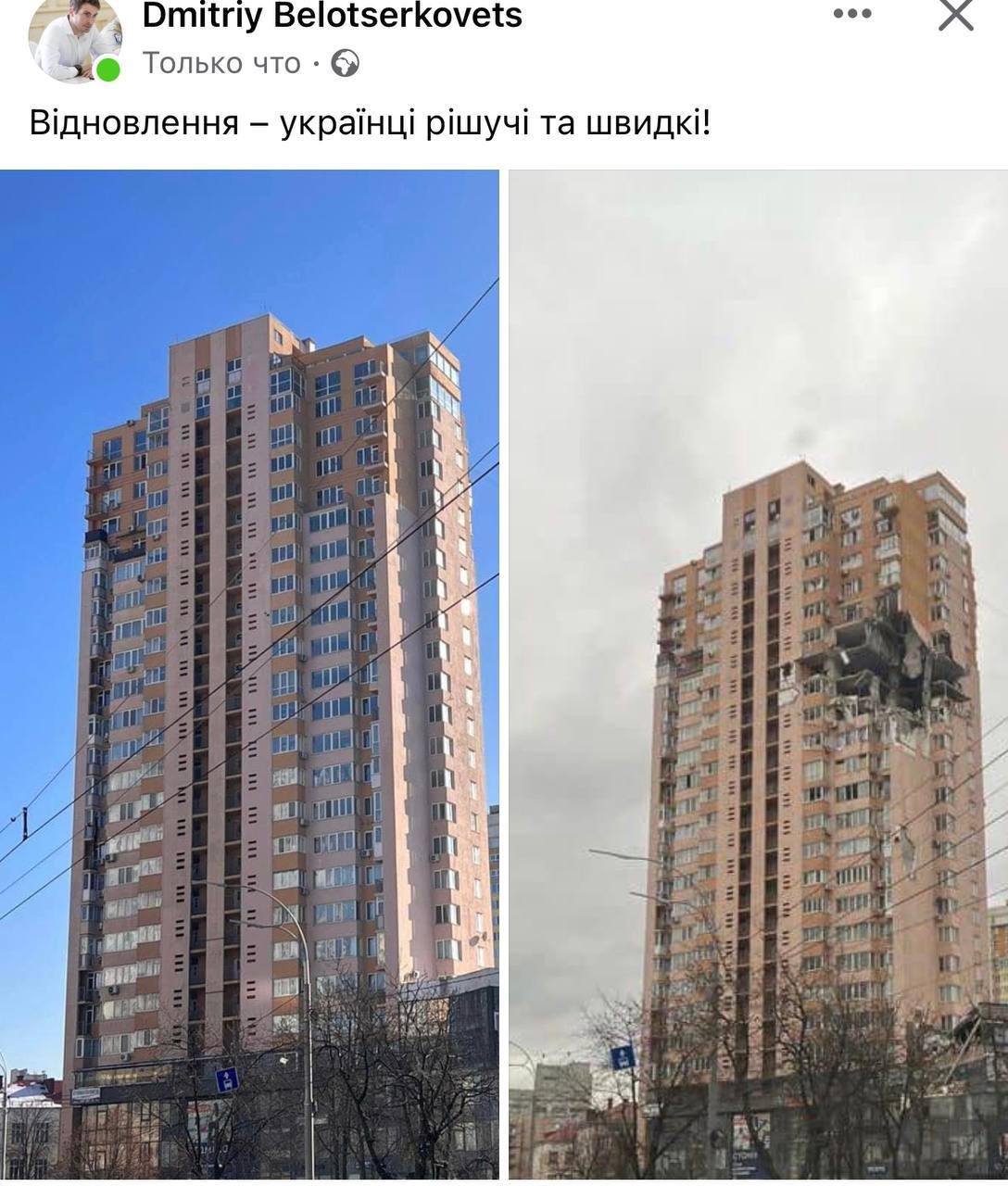 Советник мэра Киева Дмитрий Белоцерковец у себя на странице в Facebook опубликовал фото восстановленного дома на проспекте Лобановского в Киеве, в который в начале войны попала ракета.