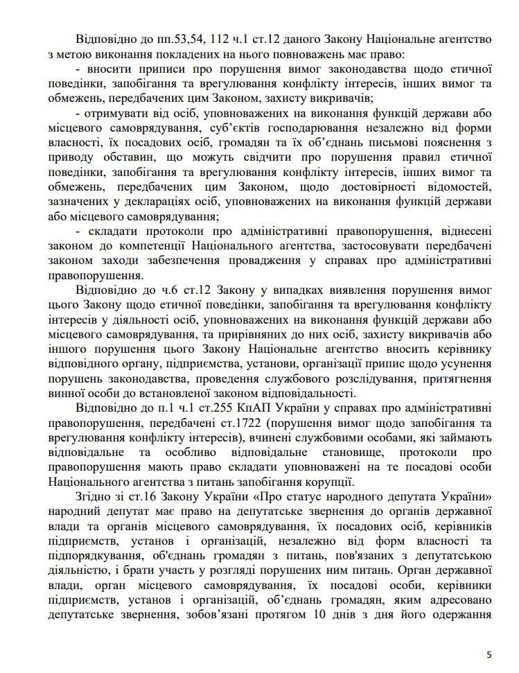 Яценко просит НАПК принять меры реагирования в отношении Железняка, предусмотренные законом "О предотвращении коррупции".