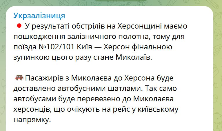 Поезд Киев - Херсон из-за обстрелов и повреждения железной дороги будет пока ходить до Николаева.