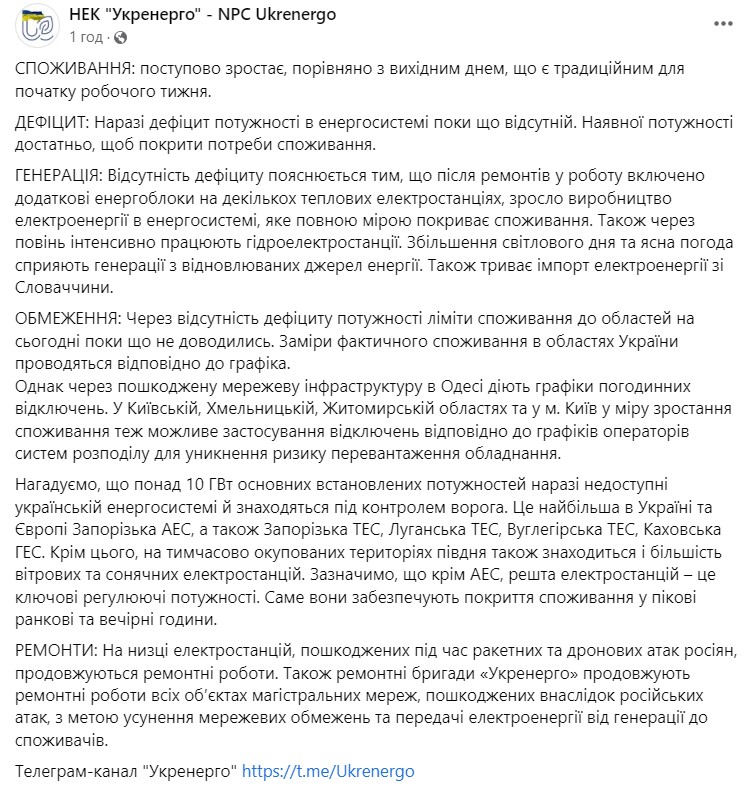 Об этом говорится в сообщении "Укрэнерго", обнародованном в Фейсбуке.